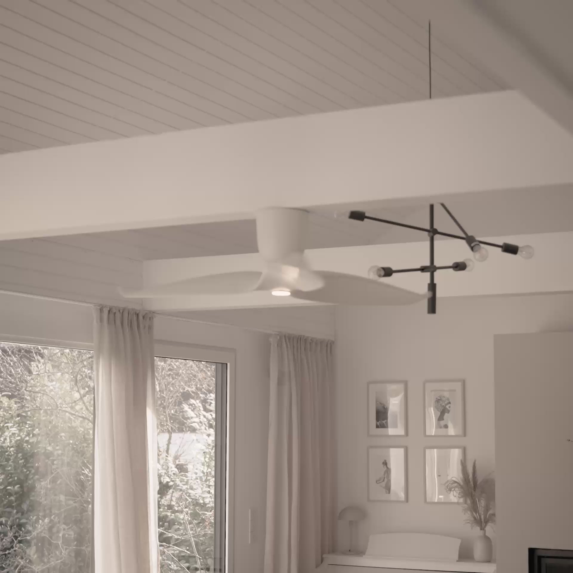 In summer mode, they move the air downwards from the ceiling, creating a noticeable air flow that produces a pleasant cooling effect on the skin. In winter mode, on the other hand, the fans work in reverse: they transport the cooler air from the floor upwards, forcing the warm heating air towards the walls and distributing it evenly throughout the room. This optimises heat distribution, reduces heating costs and ensures a comfortable living climate.